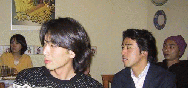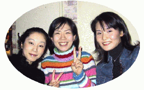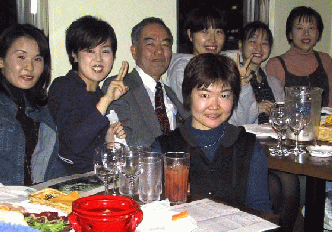 この左の写真は女性軍プラスα。左から篠原、小島(藤沢)、相沢、中村、福岡、田中(渡辺)、前面は山田さん。篠原さんは大学の専門を生かしたアパレル関係の仕事。 小島さんは同学年E組だった藤沢浩生君と一昨年の9月にハワイで挙式。目下MR(CTの一種)専門の看護婦さん。小渕前総理などのMRを引き受ける病院とのこと。中村さんは警察庁勤務をこの間まで続けていて、福岡さんはNTVのニュース関係の編集者。「今日のハイライト」などは4日に1回くらいは彼女の編 集。田中(渡辺)さんは目下2ヶ月後に出産予定の2人目のお子さんがお腹にいるのに参加してくれた。山田さんはイタリア料理を修行後現在は銀座のお花屋さんに勤務。 |