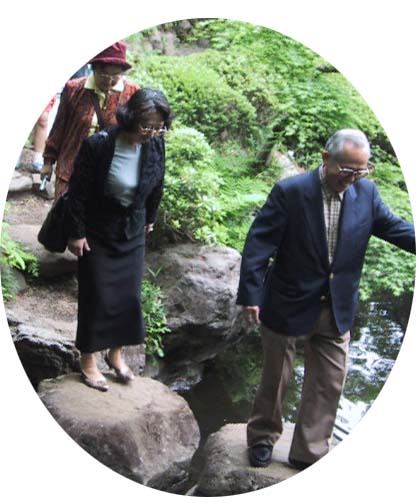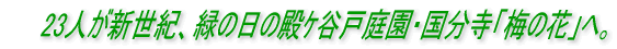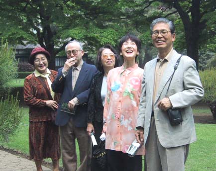 天皇誕生日いや「緑の日」の4月29日、3年ぶり62才の新世紀を迎えた顔合わせであった。まずは立川氏の呼びかけで有志が国分寺の南口すぐのところにある「殿ケ谷戸庭園」に参集。当日12時に顔を見せたのはこの写真の左から、折原(松田)、加藤、迎(峯尾)、出口(石島)、立川の諸氏にこの私、相沢の6人。 あとで柴田、佐藤(将)、長(榊原)の3人が加わり全部で9人。「緑の日」の特典でこの日だけは入場料はなしとのこと。皆にタダで入ってもらおうと考えていた配慮深い立川氏のもくろみは図らずもおじゃん。