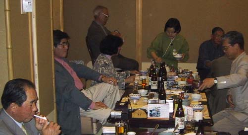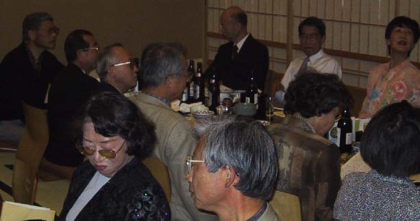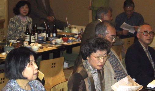 下の写真は角度を変えて、上の写真の、後ろ向きの人たちを写したもの。 手前左から、藤田、組村(鷲尾)、篠崎、加藤の面々と、その後ろに後ろ向きなのが阿曽氏。白い紙を見ているのが幹事の佐藤(社長)。左上の女性は長(榊原)さん。彼女は気を利かせて先生の介添え役を。