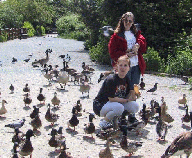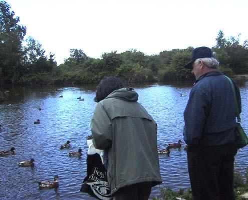 right.などと返してやるようなありさまであった。パソコン室のプログラムは丁度日本のセンター試験の英語程度の内容の日本語による問題で、内容に関して与えられた回答の選択肢から選んで答えていくやり方だった。進度はまちまちで出きる子はかなり細かい内容の比較的長い文もこなしていた。3割くらいは東洋人の顔つきの生徒で、親か祖父母などが日系人で、そのための興味から日本語を選択したようであった。1年間に記憶すべき漢字もA4用紙半分くらいあり、漢字の暗記テストが成績に入ると 先生がいうと、生徒がため息をつく風景もあり、いずこも同じ教室の反応であった。でも日本語による創作スキット(寸劇)は、結構熱演もあった。誰かがどこからともなくお手玉をもってきた。しかし彼らはすぐに円陣を作り、それをサッカーボールよろしく蹴上げて回し始めた。先生までそれに加わった。やっぱりここはカナダなんだ。帰りに入り口でCollins校長に紹介された。そのときたまたま警官が現れた。何だと思ったらこの学校担当の警官で、定期的に巡回して来るという。授業にも出て、 話もするそうである。1400人もの生徒がいる公立の大規模校だし、いろいろなことが起こっているようであった。ついでだが、Hladik夫妻の隣のうちの奥さんは小学校の校長さん(左の写真の左側の人)だった。ある朝学校から戻ってきたのにぶっつかった。何だと思ったら、飼い猫が昨夜から行方不明で心配になったらしい。先生方が授業中に、猫が気になって帰宅できるのは管理職の特権ですな、と言ったら苦笑いしていたが、昨夜は遅くまで父母との協議会が延々と続いて大変だったと、その苦労を早口でまくし立てた。いずこも同じ、せちがらい「師走」の時代になったようだ。 Tsawwassenというところはカナダの西海岸を南に向かって細長く垂れ下がった半島の中程にある。その半島の先はアメリカとの国境となる北緯49度線の南まで延びていて、その部分はアメリカ本土から離れたアメリカ領土になる。その「小さな」アメリカへ案内してもらった。一応国境の検問所はあるが、カナダ人は簡単な身分証明書だけで通過できる。通貨もカナダドルが普通に使えるようだ。 特に面白いのはこの右の写真のところで、この道路が国境になっている。この中央から左がアメリカで、右側がカナダである。ここは人が住んでいる区域以外はフェンスもない。車で通っていたら、右側の家から、フェンスを越えて犬が出てきた。道路に侵入してきた犬を見て車を止めたHorstさんが言った。「おまえパスポート持ってるか?」と。柵の向こうの家の庭でバーベキューの夕食準備をしていた奥さんが笑った。Bird Sanctuary「保護区」へ つぎの朝、Horst氏がこのTsawwassenにある「鳥類保護区」へやるという。この半島の周囲は湿原にもなっていて、10月下旬にもなると、数十万羽の渡り鳥で埋まる場所でもあるという。保護区の入口は厳重にフェンスがあり、シニアつまり60歳以上だと2ドルでフリーパス。中は広い。入口のところから小さなCanadian