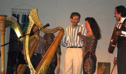 Geeseが群をなして我々に迫ってくる。中には私の足をくちばしでつついて餌を催促する。入口で50セントだすと餌を売ってくれたらしいのだが、うっかり買わなかったので、大変である。あ とできたカナダ人の女性たちはちゃんと買っていたけど、鳥達のしつっこさに悲鳴をあげていた。今はオフシーズンのはずで、鳥が居ないはずなのにと思いきや、簡単に餌にありつけることから、。住みついてしまったのだという。鳥が人間を襲うヒッチコックの映画「鳥」を思い出してしまった。ずっと奥にいくと、鉄塔のような展望塔があった。高所恐怖症をおして登ると、 帽子を押さえていないと飛んでしまうほどの強風で、恐る恐る見渡すと、一面の湿原で、向こうに雪をかぶった山々が望まれた。熱帯の方からアラスカの方に向かったりその反対方向に行く渡り鳥がここで骨休めと栄養補給をするには最適の場所のようだった。ハープ・コンサートの夕べ 6/9の晩、Horst夫妻が仲間の退職記念パーティに行く予定になっているのにハープのコンサートの券があるというので、行かせてもらった。地方のコミュニティ・センターだったが、丁度教会のようなこじんまりした場所で、観客もお互いに顔見知りみたいで、家族的な雰囲気であった。ハープの専門の女性は2人でそれに、変わった楽器をあやつる男性が一人と、ハープの女性の小さな子供が時々共演していた。途中でその子が一人でGreen