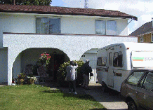 もとはと言えば25年前にさかのぼる。当時小山台高校を訪問して英語の授業を手伝いながら、短期間に日本文化に触れたいというカナダ人がいた。たまたまホームステイ先を探していたので、私の家に1週間位滞在してもらって、周辺を案内したり、家族でお茶お琴などに理解を深めてもらった。そのあとクリスマスカードのやりとりは続いていたが、今度私の退職を機会に、カナダでアパート暮らしを1ヶ月くらいやってみようと、彼ら夫妻に斡旋を頼んでみた。バンクーバー近くで、家具付きの上、短期間契約で交通の便がいいところとなるとなかなか難しいようだったが、たまたま彼らの友人の一人がイギリスに旅行している間、そのアパートがあくので、1週間12,000円でどうかという話があり、OKした。それはバンクーバーから南に車で20分くらいのLadner というベッドタウンで、歩いてマーケット街にいける位置なのに、静かな2階建ての1階だった。この写真の右側中央付近の部屋である。中は1LDKというのか、大きなダブルベッドとL字型のソファ(彼らはChesterfieldと呼ぶ)にきれいなガラス板のテーブル。エアコンやステレオ、テレビなどに加えて、片側の壁には前面が一面全体、鏡になった箪笥のような家具があり、2カ所に蝶番があるので、何だろうと背後を調べたら、後ろから入れる収納庫だった。台所は4つの電気コンロがあり、大きな冷蔵庫の中にはHladik夫妻が果物から、朝食のトーストに塗る黒ゴマスプレッドまで用意してあった。 梅雨の日本を脱出してきたのだか、こちらでは5月晴れに戻ったようで、暑くなく寒くなく快適そのもの。ただ部屋の中は、欧米はいつもそうであるように、部屋全体を照らす照明がなく、スタンドが3つ、それぞれのコーナーを照らすだけだし、風呂場の脱衣場の真上から熱線を照射するヒートランプ、敷き詰められた分厚い深緑の絨毯から、食卓の砂糖や塩の入れ物、紙ナプキンの込み入った模様まで、ここはカナダだなあと実感させてくれる。 冷蔵庫に用意していてくれたもので簡単に軽食をすませ、ベッドにちょっと横になったとたんに、時差疲れからか、寝入ってしまった。電話のベルで目が覚める。もう次の日の朝だ。奥さんの Margaretさんからの電話だった。1時間後に迎えにくるという。彼らの家はそこから車で15分くらい南のTsawwassen(ツァワッセン)という、やや高級な住宅地。港が近く、そこからは対岸のバンクーバー島(と言っても九州くらいの大きさの島だが)のブリティッシュ・コロンビア州の州都であるVictoriaへ大きなフェリーが出ている。彼女の夫Horstはそのフェリー会社の技師で
