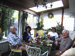 of British Columbiaのキャンパス内にある学生寮の寮長をやっていた人だが、もう引退して悠々自適の生活。200坪くらいの敷地には白壁の木造2階建ての母屋以外に、ウラにはHorstさんの大きな作業棟と小さな物置の他に、 キャンプ用のトレーラーが大小2つ、ボートが2艘、ホンダとフォードの乗用車、フォルクスワーゲンのボックスカー、ビートルと言われたカブトムシ型の車、それに車庫には少し古い大型のキャデラックまでそろっている。こどもがいない2人だけの家庭に車だけでも5台もなぜ必要なの、とからかってやったら、奥さんは、ばつが悪そうに、全部中古だから全部たしても1台の新車くらいの価値しかないのよ、と言っていた。しかしどうも主人の趣味のコレクションらしく、友達が年をとって運転できなくなったものを安く譲ってもらったんだと弁解する一方で、彼が車を見るときの並外れた好奇心は、そばにいてもよく分かった。ドイツ系の技師だけあって、無線は短波、FM、中波すべてをこなし、特別の免許をもっているので、自分で裏庭に大きな鉄塔を建てて、世界地図と連動させて、リモコンで正確な角度に向きをかえて交信していた。その音の感度の良いこと。短波も、とても短波と思えないほどのものだったが、ほとんど日本製だという。パソコンもWindows2000で、我々のためにGlobal IMEを入れてメイルで日本語が読めるようにしておいてくれたのだが、返事を日本語で打とうとすると調整がうまくいかず、メイルを出すのは英語になってしまった。ついでに、付近のパソコンショップでカードリーダーを買ってプレゼントし、私のデジカメのメモリーにある800枚もの写真をパソコンに取り込んで、彼らに見てもらい、私はCDRWに入れて持ち帰らせてもらったのは助かった。 この写真は 彼らの家の2階にある10畳くらいのサンルームで、屋根はガラスになっているのだが、何とHorstさん(右端)が自分で建てたという。1階からの太い通し柱が何本もあり、大きなガラス窓のデザインといい、の天井の造作といい素人とは思えないできであった。カナダ最後の日に、彼らの友人Albert氏(左端)とその奥さんのJasmineさん(その隣)が訪れてきたときもこのサンルームで談笑したが、パーティにも使えるスペースなのだ。一方Margaretさんの方も蒐集家で、antique(骨董)と聞くと、とたんに目に色が変わる。子供が居ないので、SweetieとBlackieという2匹の猫が居る。 Victoriaで、A