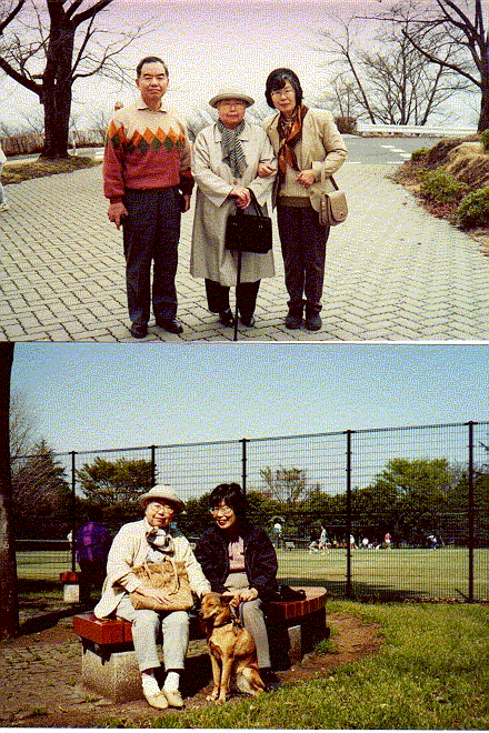 3月23日(日)はまだ少々寒さの残る時期 だったが、おばあちゃんと和子、悦子健夫、の4人が、2年前、おじいちゃんが 倒れる直前、旅したあとを再現した。 五百羅漢を拝んでから、長瀞手前の寄居かんぽセンターでゆっくりバイキン グに興じて、美の山公園にあがったところがこの1枚になった。 おばあちゃんは足が不自由で長くは歩けないので、こっそり車椅子を積んで 行ったが、車椅子があると分かると、なお元気が出て、ほとんど使わずに、何と か支えられて歩き通した。 おじいちゃん、おばあちゃんがよく泊まった長瀞ホテルは、水の音以外は、 静寂そのもので、自然の懐に飛び込んだ感じの夕べであった。 翌日は、カタクリの里に出かけ、まだわずかにしか開花していないカタクリ の花を見て、ワイナリーでマスカットのワインを試飲しておじいちゃんのふるさ との香りを味わって帰京した。 4/12(土)は桜もほとんど散って、萼の部分が葉桜の緑の中で、かすかなピン クに色を添えて、独特の雰囲気を感じさせる小金井公園へ出かけました。 桜ならぬcherry君も同行して、忠犬ぶり(?)を示そうとしておばあちゃんを 引っ張りました。 この1枚は小金井公園の中のテニスコートの前ですが、今度機会があったら 、タントテニス大会もどうかと思いますが、如何ですか。でも予約が殺到してい るようなのでかなり前に押さえる必要がありそうです。 タントのホームページへの原稿は次のアドレスまでお願いします。 azw@po.cnet-tc.or.jp |