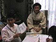 | ◎本日のハイライトは和子の婚約者の大津和久氏と彼のご両親の田無への来訪 でありました。結婚式はホテルフロラシオン青山で5月11日の予定ですが、本日 両家の両親を保証人として婚姻届に署名を終えました。1番左が和久氏のハンサ ムなプロフィール、次がお父さんの浄氏の貫禄。3番目の正面の和服の麗人がお 母さんです。左端はお客さまを迎えるにしては愛想のない我が家のチェリー(別 名さくら)であります。和久氏は農林水産省の農業環境技術研究所の研究員をさ れていて、道彦家の近くのつくば学園都市に在住です。お父様は日立金属商事株 式会社の常務取締役です。お母様は茶道、華道、書道に通じておられ、お弟子さ んがたくさんおられる様子でした。妹さんがこの4月13日に結婚されたばかりで 、大津家はこの2か月の間に、お二人の子供さんが二人とも独立されて、夫婦が 新婚時代に戻られることになりました。新しいタントのメンバーの誕生を皆で喜 びたいと思います。 | |||