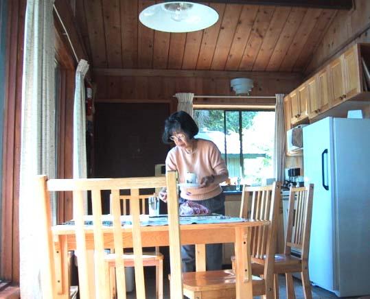 外から見ると入口には馬鹿でかいゴミ箱(bin)が置いてあり、鳥の声がよく響くベランダには椅子がある。そこでは波の音を聞きながら読書している人もいる。近くには店などないので皆食料持ち込みで、料理を楽しむ。我々はあまり手をかけず、鮭缶やサラダに紅茶、ジュースなどで夕食を済ませた。海岸は、ときどき散策する人やゴムのスーツに身を包んでサーフィンを楽しむ若者が少々。夕食後、女性達は元気がないので、Horstさんと私でビーチを歩いてみる。 彼はドイツ系の人で、英語よりドイツ語の方が得意のようだが、なかなか社交的な人で、誰にでも話しかる。途中で会ったサーファーの女性も一人でのんびりと海に出ていく。彼の服装が冬支度であるのを見ても、寒さが分かろうというものだが、私などジャンパーの襟を立てて海風で顔がこわばるのを防いでいたくらいだった。でも林の中では色とりどりの小鳥やリスまでが顔を出す。ここへ来る途中、道路のすぐ脇に熊が腰を下ろして座っていた。こんなところで熊が現れたらどうしよう!