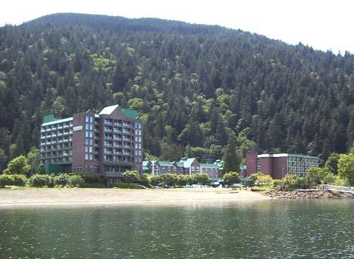 バンクーバー市内から車で2時間程東に走ったところにある小さなリゾートだ。ほとんど全室がすぐ前に広がる大きな湖に面している。レイク・ルイーズのように派手な花などは植えられていないが、摂氏80度の温泉が近くに出ていて、そこからパイプで引かれたお湯は大きな中庭にプールのような3つの温泉風呂(1つは温水プール)を作る。大きな庭石などの中に露天風呂のような感じで配置されてはいるが、ここでは必ず水着を着けて温泉に入るし、 下が平らなコンクリートなので、暑いお湯のプールといったイメージである。実際私はゴーグルを着けて泳いでいた。彼らはぬるいお湯が好きらしく、3種類の温泉は温度差がつけられているが、いつもぬるい方が込み合っている。部屋のテレビで見るとアメリカの南の方は摂氏40度近いようだが、こちらは寒いくらいで、露天風呂も、出ると身震いが来るくらいであった。外出時にはウィンドブレーカーが丁度良いくらいである。