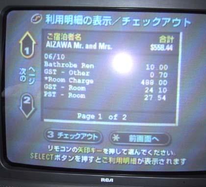 このホテルのテレビはちょっと変わっていて、リモコンのボタンでチェックアウトができる仕掛けになっていた。日本人も結構泊まるようで日本語の画面もある。チャンネル用の数字のボタンを押して、質問に答えていくだけで、カウンターで待たされることなく、カギを返すだけになるので、便利といえば便利。カナダの辺鄙な場所なのに、こんなモダンな仕掛けがあるのにびっくりした。