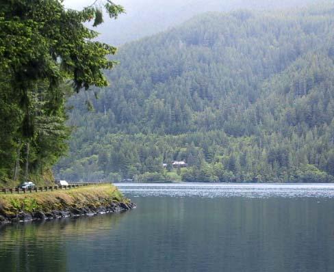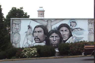 日本の不況による「転身」 ヴィクトリアから去る日にHorst氏が車で迎えに来てくれた。北のNanaimoへ通じる道は海岸沿いに美しい風景が垣間見られるのに車は少ない。バンクーバー島から本土に行くフェリーはこの2つの町からだけだ。途中シェメイナスという町に寄った。ここは これまで日本へ材木を輸出する基地でにぎわったらしい。それが日本の不況から材木の値段が急落し、輸出がほとんどなくなったという。そこで町が考えたのが「観光都市」への転身であった。そしてその目玉にされたのが原住民のインディアン文化であった。このシンボルマークとも言えるこの右の彫像には材木業で生きてきた人たちの思いが込められているようだ。 町の中心部にはインディアンのイメージがやたらに目に付く。開拓時代の歴史を壁一面に描き出し、雰囲気を高める。土産物屋もインディアン一色。どこからともなく聞こえてきたのは南米ペルーの音楽「コンドルは飛ぶ」だ。その方角へ進んでみると、森の中に、大きな野外ステージが見えてきた。広い観客席には2、3人のアメリカ人らしい老夫婦が座っているだけだ。 ステージでは3人のインディアンらしい男性が竹を並べた笛のような楽器やギター、キーボードなどを操って、我々に会釈をした。見事な演奏に我々もしばしたたずむ。やがて1曲終わると、さっきの老夫婦はステージの方へ出ていってお金を渡した。我々はそばに置いてあったCDを買った。街道沿いには このあたりでは珍しいB&B(Bed and Breakfast)という看板が目に付く。安宿である。土産物屋も工夫をこらしていて、派手な人目を引く色を使って、種々雑多のものを並べている。その他古物商、植物商、コーヒーショップ、レストラン。それにしても人が少ない。これで暮らしていけるのだから不思議だ。でもこの不況の影響がこんなところにも及んでいるのは意外だった。![]() 別の一角に大きな明るい茶色の建物が目に入った。看板に注意すると劇場ではないか。しかもバナード・ショーの喜劇をやっているらしい。入るだけの時間はなかったが、イギリス系の国の最後の抵抗かなと思わず苦笑した 更に車は北へ。Nanaimoまでの道の道路側には黄色い花が一面に咲き乱れている。聞くとgoseというのだそうだ。でもこの語は辞書には見つからない。ただ途中展望の良いところで一休みしたらドラム缶が鎖につながれて二つぶら下がっていた。 ゴミ箱らしいことはすぐに分かったが、鎖が謎だった。Horst氏が教えてくれた。熊が餌を求めて出てきてひっくり返すので、それを防ぐための工夫だそうである。景色も確かにきれいだが、5分に1回くらいの割合で、不思議な光景によくぶっつかる。それを解いていくのも異国の旅の面白さである。![]() ![]() ●シアトルの西方の半島にあるオリンピック国立公園は、あまり人が訪れないが、美しい森と湖が点在し、Hurricane